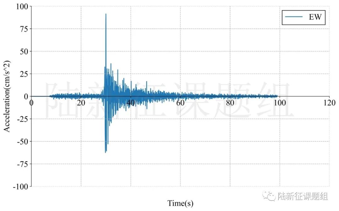 XJ.NK005典型台站位置北纬41.17度,东经83.59度,记录到水平向地震动峰值加速度为91.4cm/s/s,竖直向地震动峰值加速度为17.1cm/s/s。该地震动及反应谱如图1、图2所示。